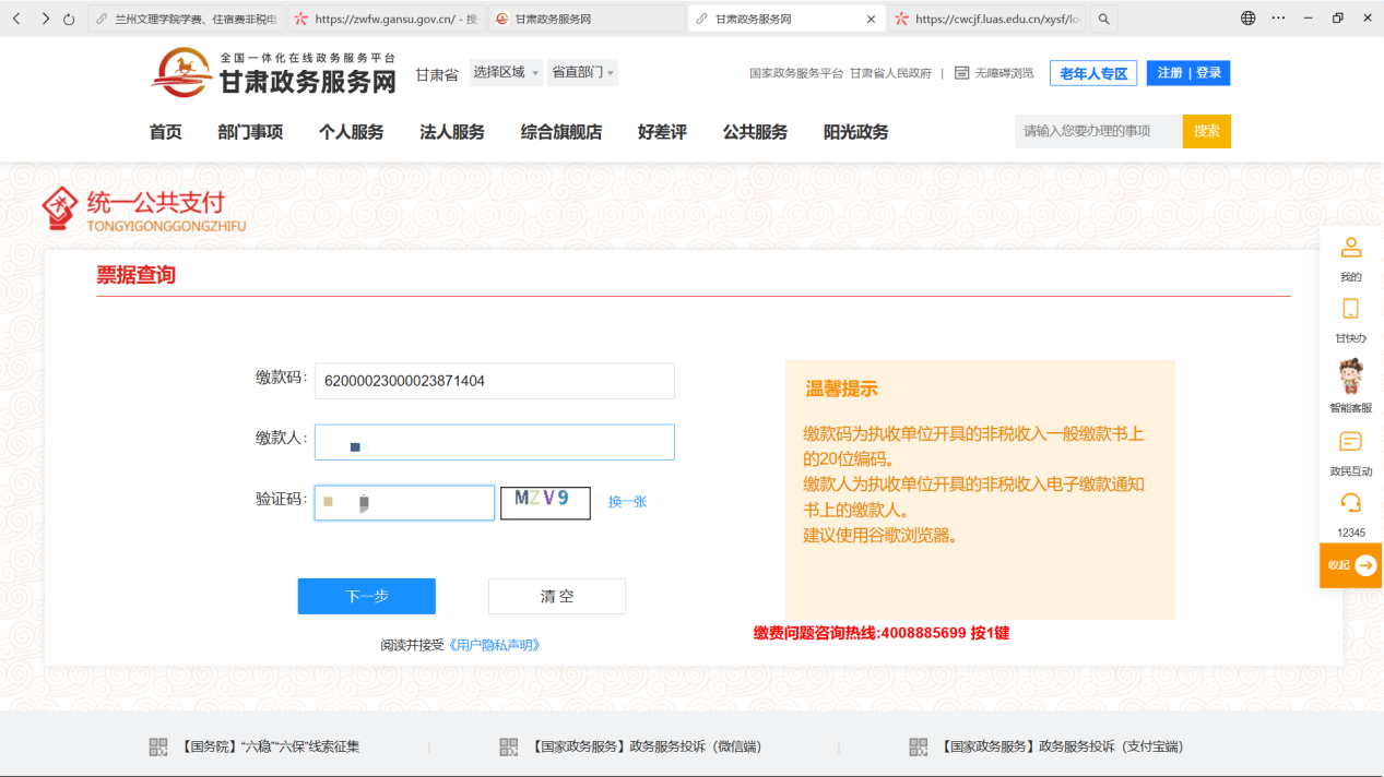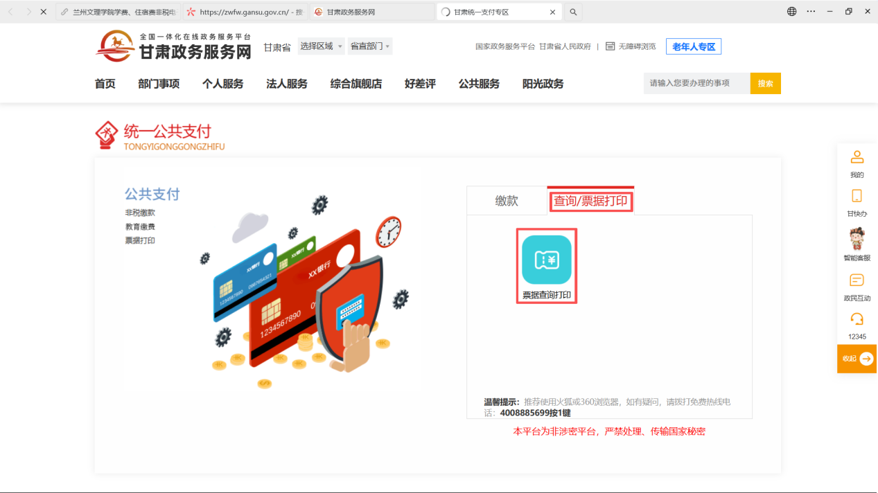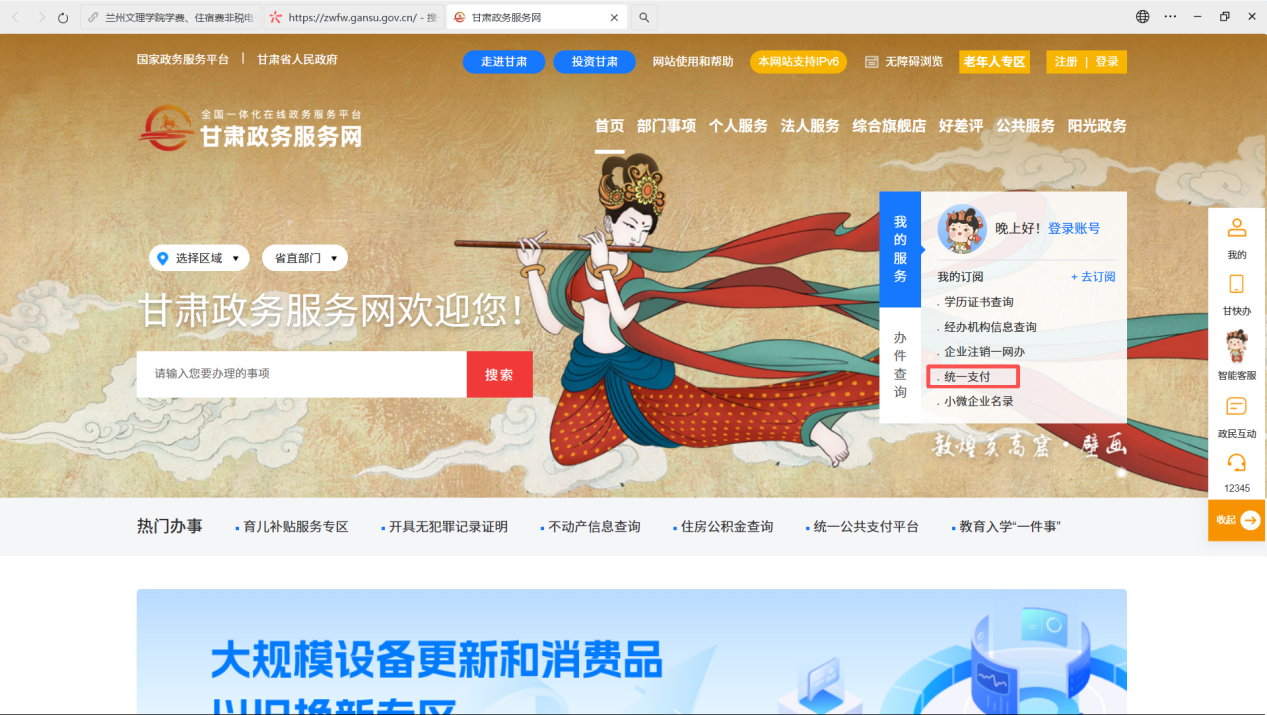 4.如果进入上述页面后,发票无法正常显示,请登录“甘肃省政务服务网”(https://zwfw.gansu.gov.cn/),进入“统一支付”。